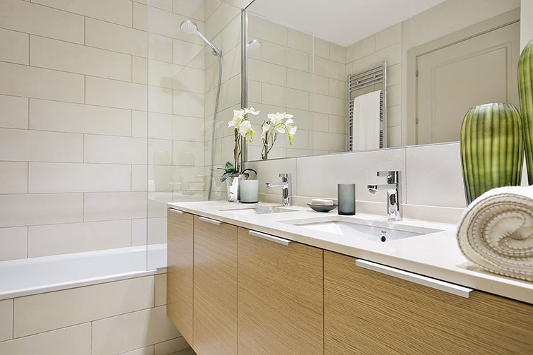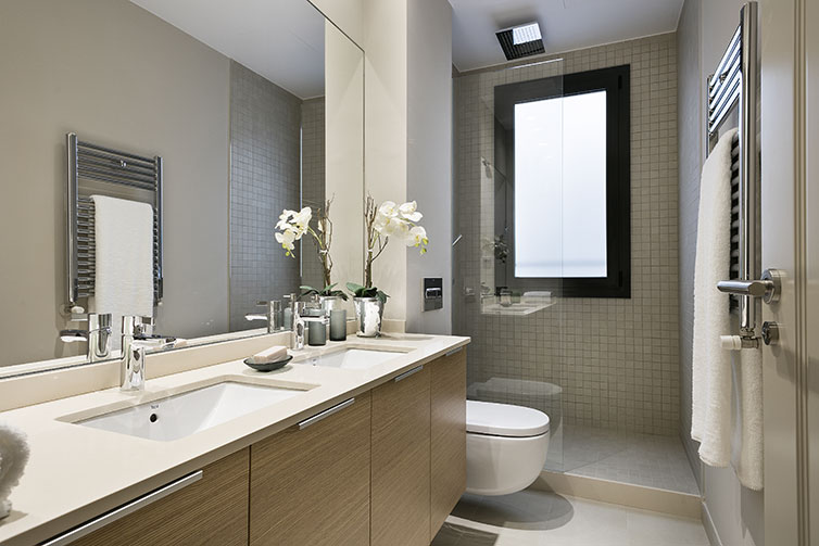 Al igual que en el resto del apartamento, la decoración del cuarto de baño guarda perfecta armonía con los detalles cálidos y modernos provenientes del estudio de arquitectura interior de Monika Kappel. Las paredes principales y los suelos están recubiertos de cerámica en una variedad de tonos beige claro, mientras que el mobiliario, con lavabos integrados, luce en marrón. Otros protagonistas son los platos de ducha hechos a medida, la grifería Hansgrohe y las bañeras, lavabos y lavamanos con la firma de la prestigiosa marca ROCA.