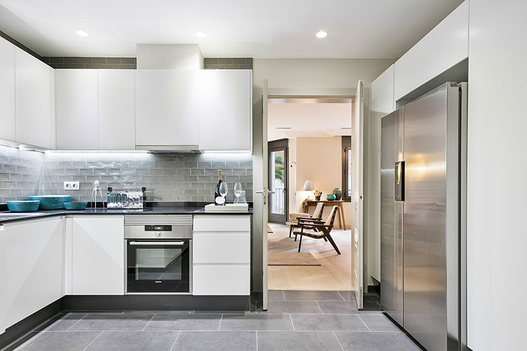 El conjunto, de estilo contemporáneo, contribuye a crear un ambiente urbano influenciado por unos detalles decorativos audaces en donde el suelo y la encimera degranito negro, así como los marcos, contrastan con la blancura del mobiliario de diseño y las paredes inmaculadas. Una puesta en escena perfectamente estudiada para integrar unos electrodomésticos de alto rendimiento y última generación, firmados por grandes marcas: SIEMENS en el caso del horno y las placas de inducción y Hansgrohe en la grifería.