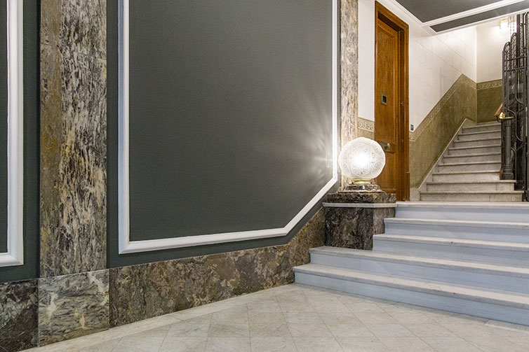 Los elementos de bella factura que se encuentran en las partes comunes también han sido objeto de una cuidada rehabilitación. Hall recubierto de mármol veteado blanco o rojo, luminarias talladas, conserjería en madera barnizada, barandilla de escalera y cabina del ascensor en hierro forjado. Todos estos elementos han recuperado el esplendor de su belleza original.