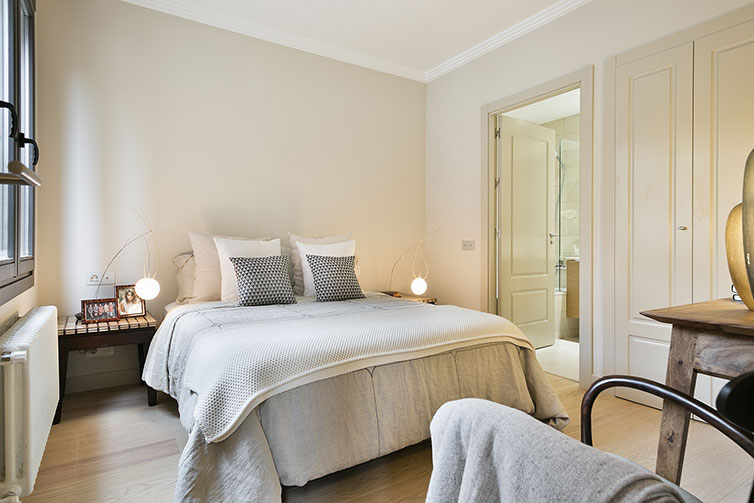 El espacio, inundado de luz natural, crea un ambiente íntimo donde se experimenta de forma inmediata una sensación de quietud y bienestar. El suelo de madera clara y las paredes en delicados tonos beige ofrecen una atmósfera cómoda y acogedora que las persianas eléctricas ayudan a filtrar para acompañar mejor el sueño. Cada habitación dispone de numerosos espacios para la ropa y los objetos personales y, cuando la disposición del espacio y la superficie del apartamento lo permiten, también de vestidor privado y cuarto de baño adyacente.
