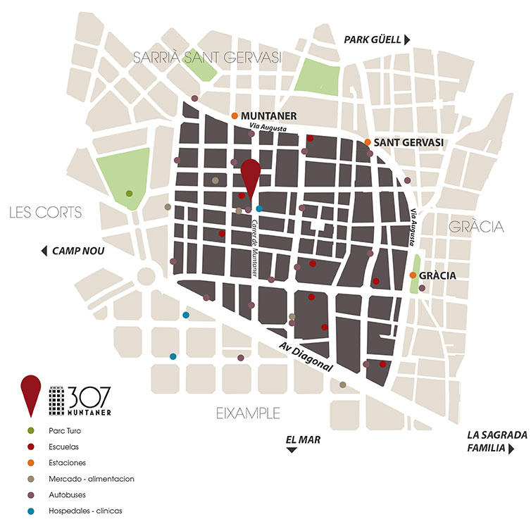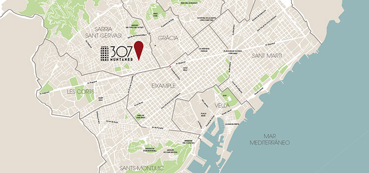 Situado al norte de la ciudad, a dos pasos de la relajante frescura del Parque Turó, de la animada Avenida Diagonal y de la lujosa arteria del Paseo de Gracia, este rico y residencial enclave ofrece todas las ventajas de una atmósfera de barrio agradable y tranquilo con sus mercados y tiendas. A tan solo unos minutos del centro histórico y del mar, gracias a una red de transportes altamente eficaz, MUNTANER 307 goza de una ubicación ideal para sucumbir a los innumerables encantos del tan exclusivo barrio de Sant Gervasi.