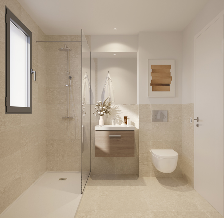 La refrigeración de las viviendas se resuelve mediante una instalación de suelo refrescante, permitiendo que la vivienda esté atemperada en verano, y se completa con una preinstalación de aire acondicionado.
